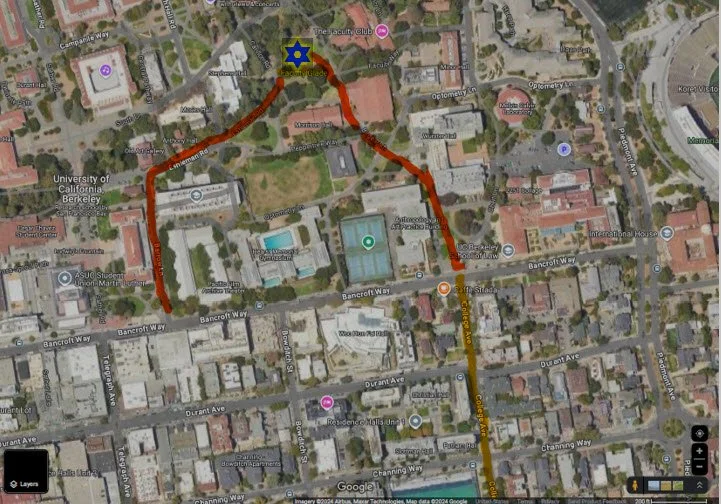 We'll meet on the Campus at the Faculty Glade (see map below, small blue star at end of red lines of walking paths from Bancroft Way), moving to Strawberry Creek for Tashlich. Bring chairs or blankets to sit on if desired. You can park nearby (metered), walk from the Church (light orange line on College Ave), or get dropped off. We will try to arrange drop-off rides from the Church.